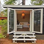 Der Innenraum ist mit einem Sofa möbliert und bietet zudem einen Ausblick auf den Garten. Die Boslodge 84 verfügt über ein Badezimmer mit einer getrennten Toilette und einer Dusche. Handtücher sorgen ebenfalls für Ihren Komfort.